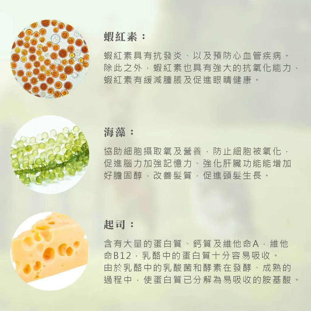 主要營養成分及含量:水分 20%以下、粗蛋白 15%以上、粗脂肪 1%以上、粗纖維 2%以下