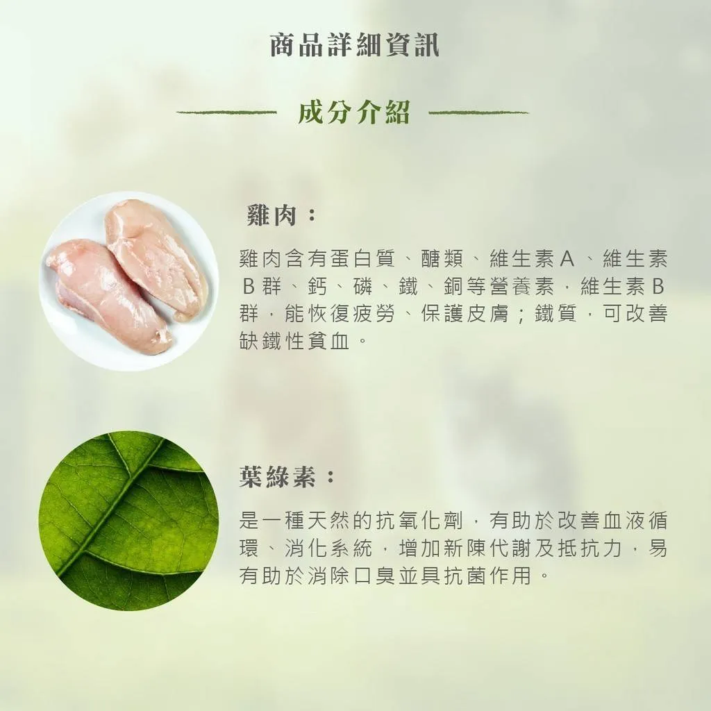 主要原料及添加物:新鮮雞肉、樹薯澱粉、大豆蛋白、甘油、小麥澱粉、葉綠素、纖維素、維生素E