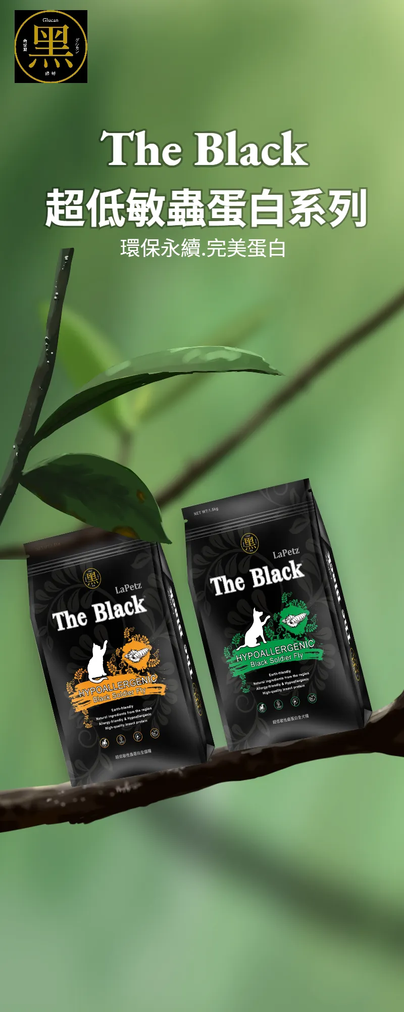 針對寵物敏感體質所研發設計,以無穀單一蟲蛋白設計配方加上獨特黑酵母等機能原料所研發之保健糧,獲得專利配方經實驗證明,除了提供均衡營養外並能舒緩過敏現象。