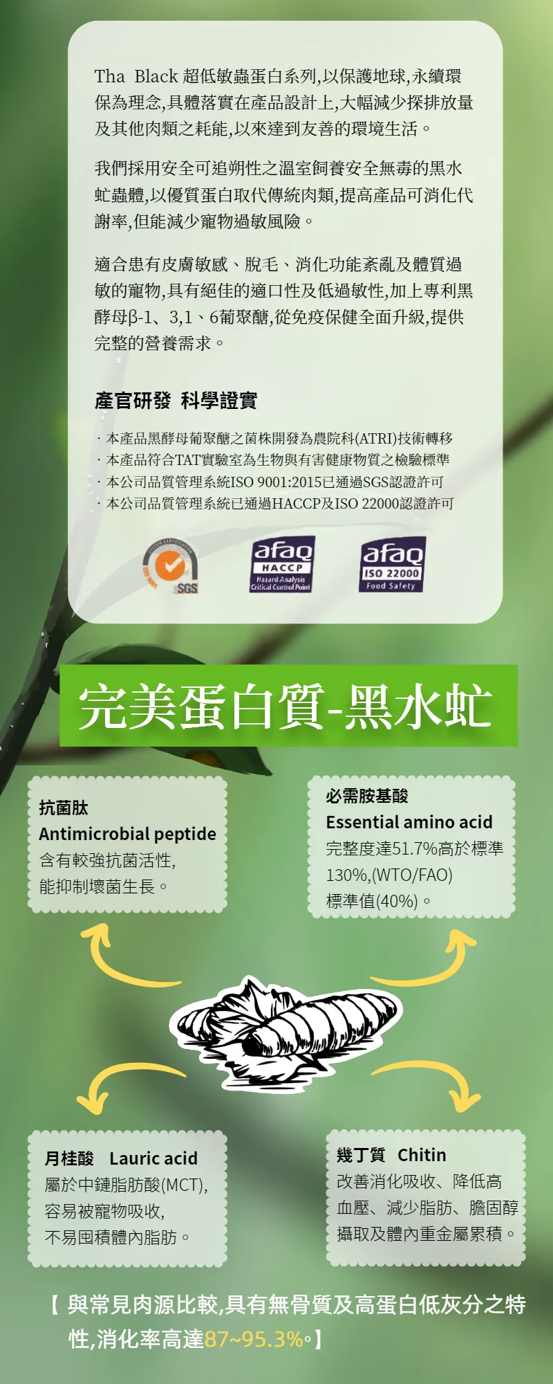 ♡黑水虻蛋白質別稱完美蛋白,具有高蛋白及抗菌肽的營養價值,來源符合有機循環的生物處理標準,為接受嚴格檢驗的再生原料,做到循環永續,節能減碳的終極目標。